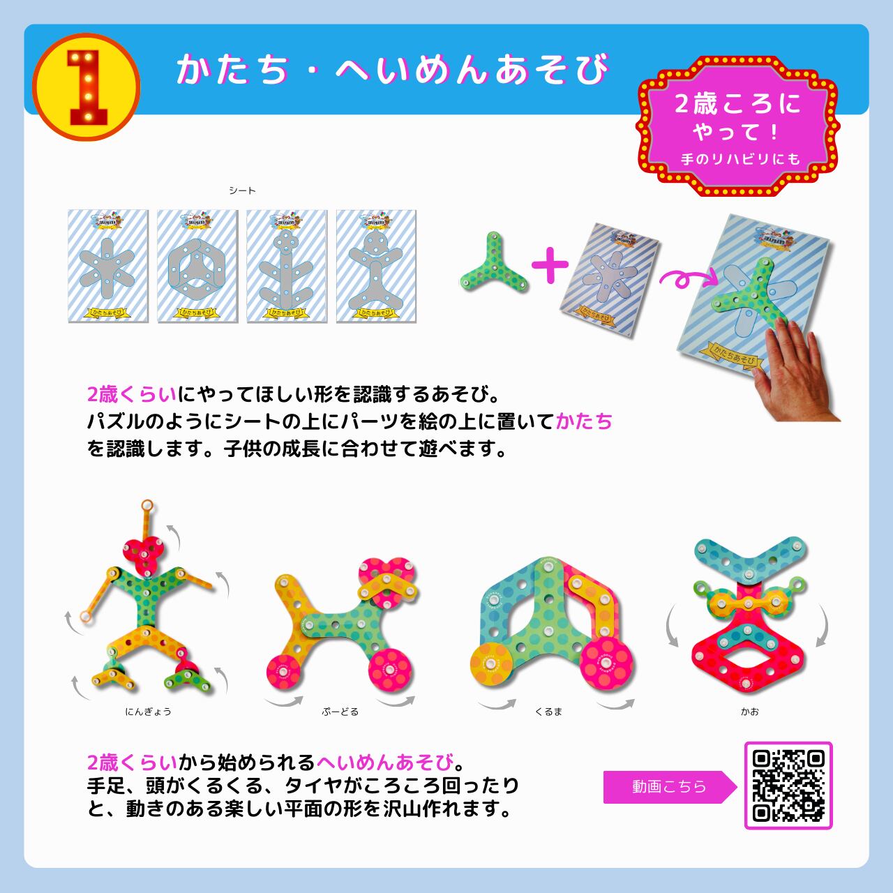 平面の形を認識するかたちあそびや、沢山のかわいいピースを沢山繋げていくでこあそび、体に身に付けたりするきかざりあそびにも挑戦して見て下さい。
